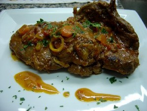 Add the lamb steaks and the meat broth until the sauce has been covered. Add salt and pepper and a pinch of chopped parsley. Bring to boil and keep the pan on low heat.